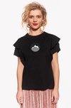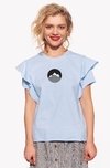 Dámské tričko s volánovými rukávy, volnější regular střih. Za jeho nedokončený vzhled může surové stříhání. Po praní se okraje mírně rolují.