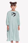Knee-length girl dress with pleats on the front and back. Comfortable 7/8 lenght sleeves are finished with an elastic band. The dress has pockets.