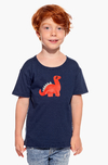 Egy gyermek póló, laza, átlagos szabással és rövid ujjal.