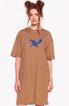 Voľné šaty v Áčkovom strihu zdobí zaujímavý detail šitia, ktorý na rukávoch vytvára “naruby” efekt. Šaty majú vrecká a ležérne dlhšie krátke rukávy.