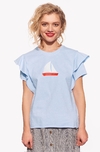 A women's T-shirt with a loose regular cut and frilled sleeves. The unfinished look is caused by the rough cutting. The edges may roll a bit after washing. The model is 165 cm tall and wearing a size S.