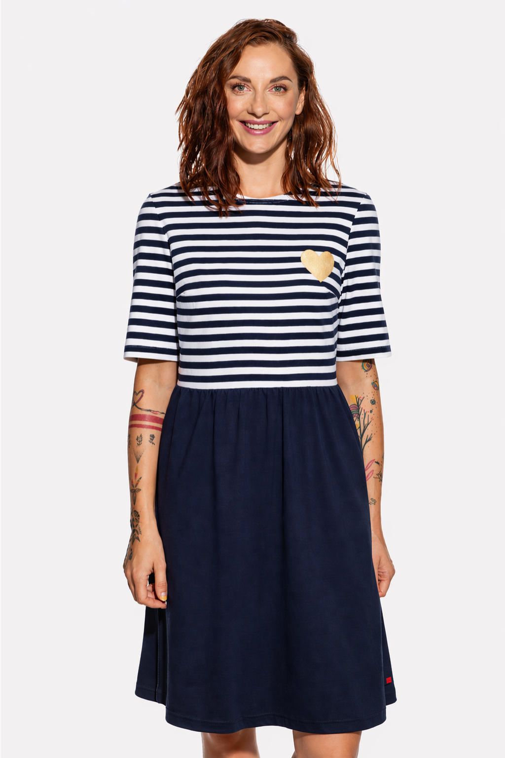 Valentína, Dámske šaty, Tmavomodrá a tmavomodrý pásik, Minisrdce zlaté